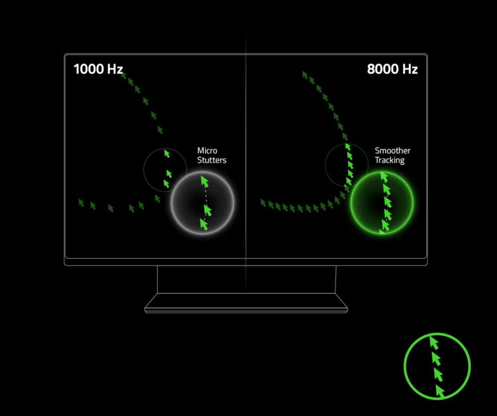 تکنولوژی Razer™ HyperPolling با نرخ نمونه برداری واقعی 8000 هرتز از استانداردهای صنعتی پیشی میگیرد. این تکنولوژی تا 8 برابر دادههای بیشتری را در یک ثانیه ارسال میکند و تاخیر را از 1یک تا یک هشتم میلیثانیه کاهش میدهد.